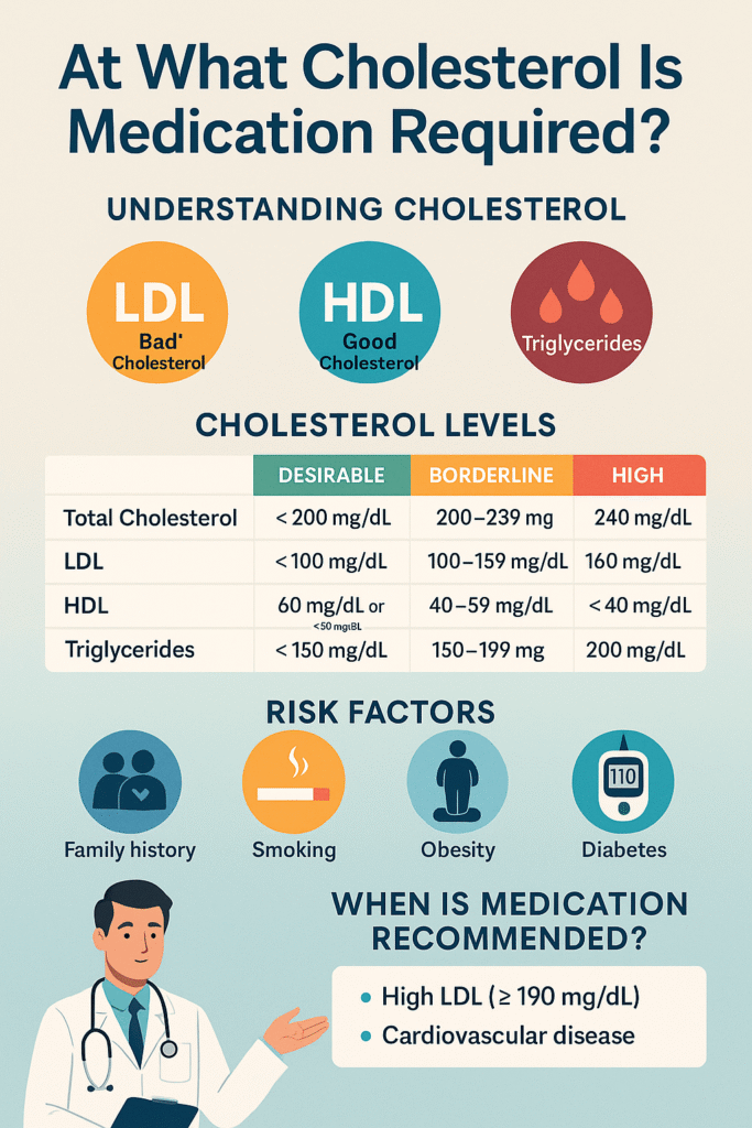 Cholesterol plays a vital role in the body, but when levels climb too high, it becomes a significant risk factor for heart attacks, strokes, and other cardiovascular diseases. The question that often arises is: At what cholesterol level is medication required? The answer isn’t one-size-fits-all—it depends on your LDL (bad cholesterol), HDL (good cholesterol), triglycerides, and most importantly, your risk profile.